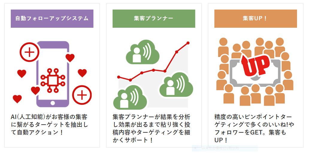 機能性の部分に関してはいずれも自動フォロー、自動いいね、自動フォロー解除、自動コメント機能でしたが、この機能に違いは無いように感じます。ターゲット分析というところでAi機能を搭載しているところもあるようです。