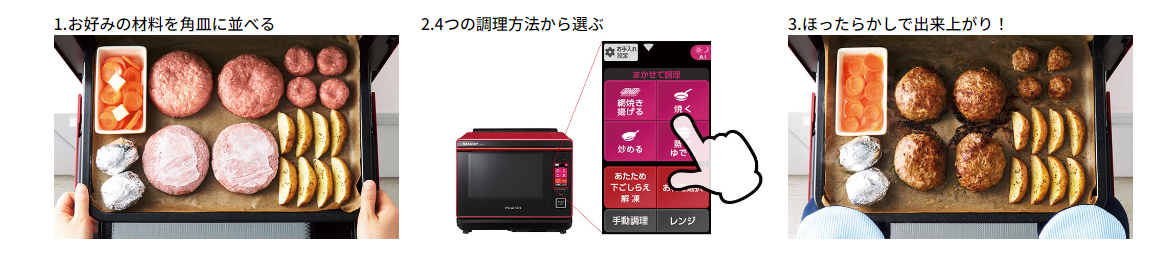 ②「まかせて調理」というキーを利用することで冷凍・冷蔵・常温とばらばらな状態でも、Aiが自動でちょうど良い加減にそれぞれの調理を行ってくれる自動調理も備わっています。