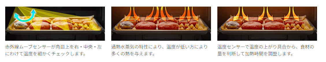 ③水蒸気に「赤外線ムーブセンサー」と「温度センサー」の2つのセンサーを組み合わせることで、ムラを抑えてほどよく焼き上げることが可能になりました。