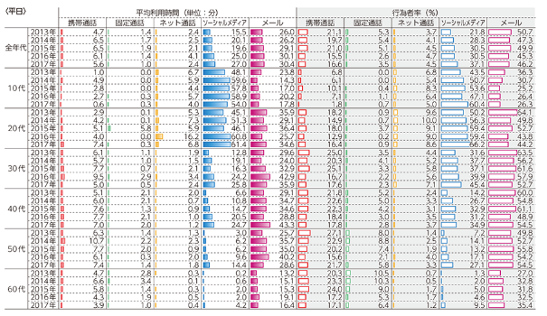 上図は2017年までの各媒体別(=電話、SNS、メール)のコミュニケーション手段の推移(=総務省調べ)です。