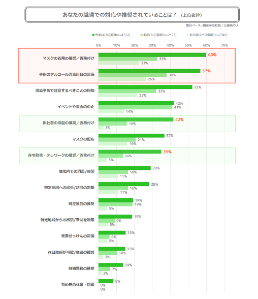 3月、2月の調査に比べると、すべての項目において対策が強化されていることがわかり、上位は『マスクの着用の推奨/義務付け』が最も高く6割となっています。次に、『手指のアルコール消毒用品の常備』が約6割弱となりました。